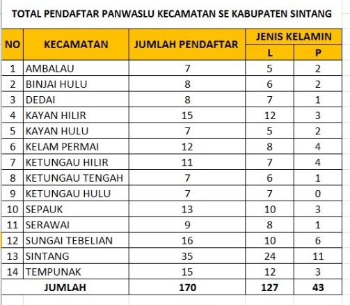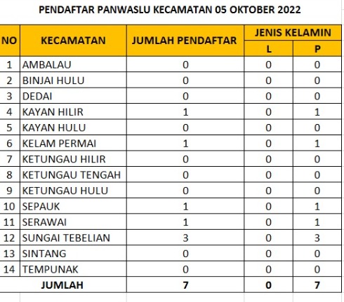 #SahabatBawaslu Berikut kami sampaikan rekap pendaftaran calon Anggota Panwaslu Kecamatan Kabupaten Sintang Rabu, 5 Oktober 2022.